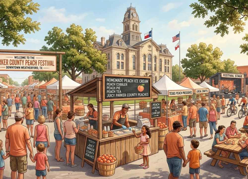 The Parker County Peach Festival takes place on the second Saturday in July. Held in downtown Weatherford with over 200 vendors, this event draws between 35,000 and 45,000 visitors every year.